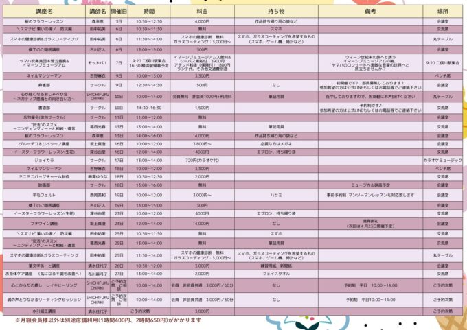 ※場所は全て「ジョイナステラス3 4F コミュ二ティサロン」