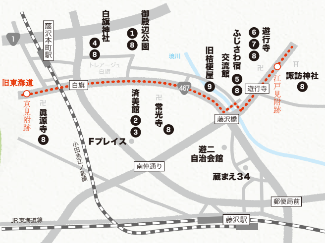 場所:藤沢宿エリア(ふじさわ宿交流館・済美館・御殿辺公園・白旗神社・遊行寺・旧桔梗屋など)