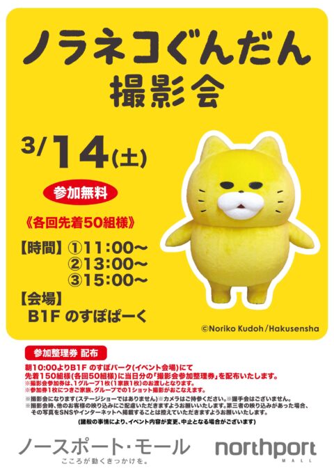 大人気絵本「ノラネコぐんだん」の撮影会を開催いたします。【整理券配布】当日朝10:00よりすべての回分を会場のB1のすぽぱーくにて配布いたします。注意事項をご確認の上ご参加のほどよろしくお願いいたします。