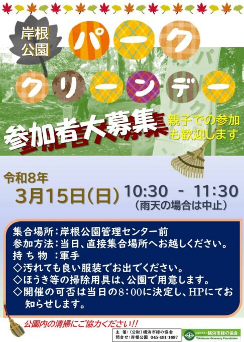 みんなのきれいな公園づくりのために、園内清掃イベントを開催します。有志の参加、また、親子での参加も歓迎します。ぜひ、ご参加ください。