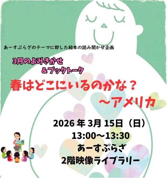 今月の読み聞かせのテーマは「春はどこにいるのかな? ~アメリカ」です。3月は春の足音が聞こえてくる時期ですね。どんなお話しが聞けるでしょうか。なお、来月から会場をおとなりの部屋のおく、情報フォーラム・フォーラムスペースで実施します!どうぞお気軽にお越しください。みなさまのご来館お待ちしています!