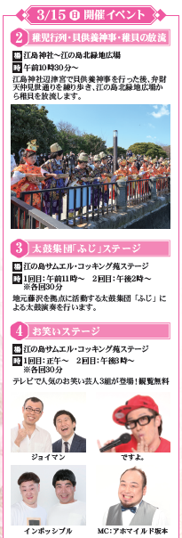 湘南江の島春まつりを代表する伝統行事「稚児行列・貝供養神事・稚貝の放流」が開催され、江島神社辺津宮で貝供養神事を執り行った後、弁財天仲見世通りを練り歩き、江の島北緑地からお稚児さんが稚貝を放流します。迫力満点の太鼓集団「ふじ」のステージや、みんな一緒に盛り上がれる「お笑いステージ」も♪