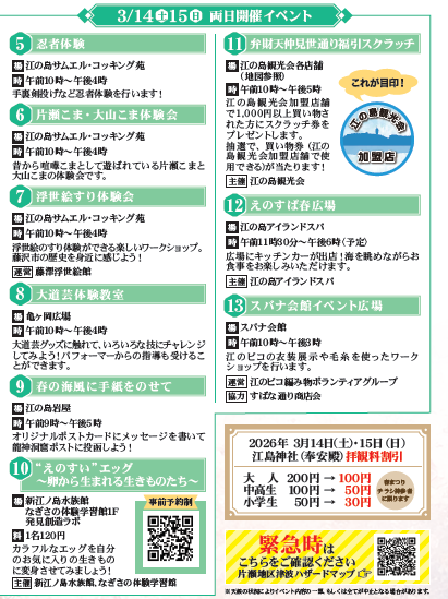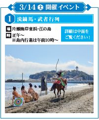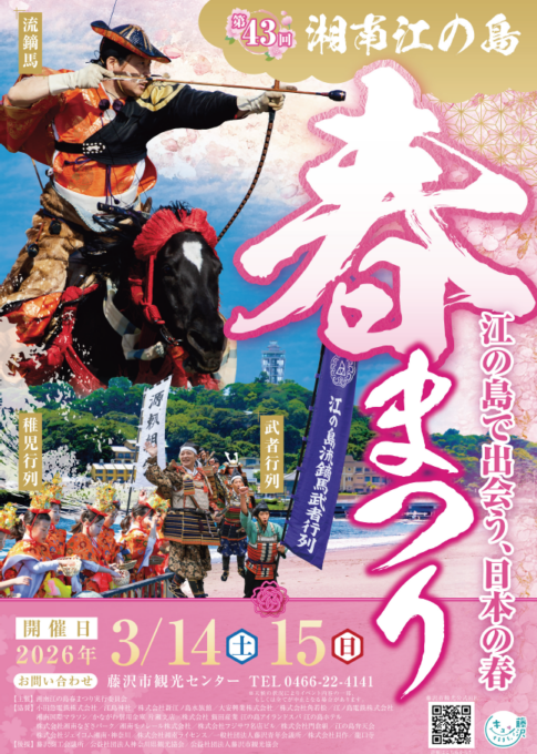 第43回湘南江の島春まつり:流鏑馬、武者行列、貝供養神事などの伝統行事や、太鼓、お笑いステージ、忍者、こま、浮世絵の体験会など、楽しいイベント盛りだくさん!キッチンカーも登場します♪[2026年3月14日(土)・15日(日)江の島、片瀬海岸]