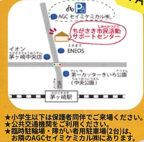 会場は、茅ヶ崎駅から徒歩10分ほどの「ちがさき市民活動サポートセンター」。すぐ近くには、あそびいで人気の中央公園もありますよ。
