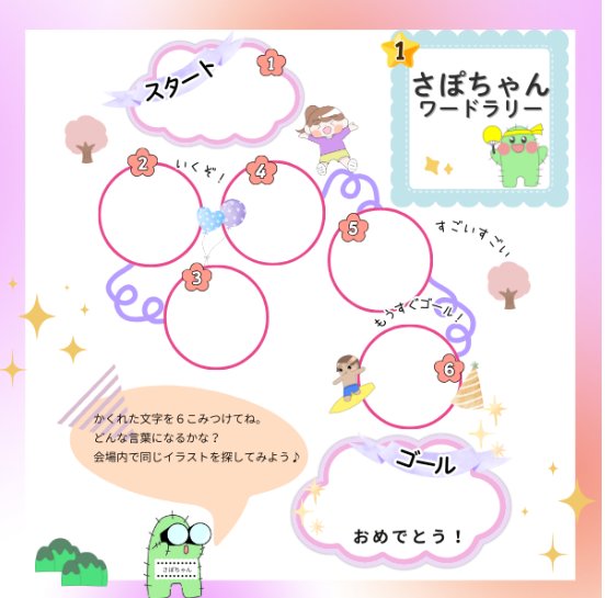 こどたん+では恒例となった「ワードラリー」。すべての文字を集めたら、案内受付までお持ちください。ちょっとしたプレゼントや特典がもらえるかもしれません♪