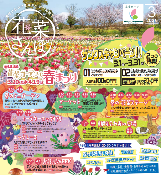 【春はじまる 花菜ガーデンの春まつり】花いっぱい!の人気の春イベント♪ワークショップ、球根掘り体験、動物ふれあい広場、エッグレース、ステージなど、親子一緒に楽しめるイベント盛りだくさん![2026年3月20日(金・祝)~4月19日(日):平塚市]