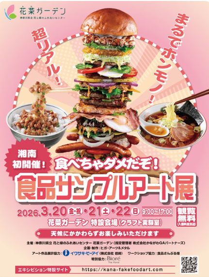 3月20日(金祝)、21日(土)、22日(日)の3日間限定で、食品サンプルアート展が開催されますよ!超リアル! まるでホンモノ!のつくりにビックリ!サンプルづくりワークショップも!親子で楽しめそう♪