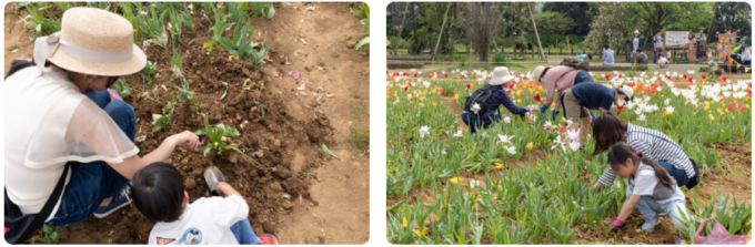 毎年大人気のコンテンツ!園内を彩ったチューリップ、ヒヤシンス、アネモネ、クロッカスなどの球根の掘り取り体験を行います。持ち帰った球根を鉢や庭に植えて、ご自宅を”ミニ花菜ガーデン”に!