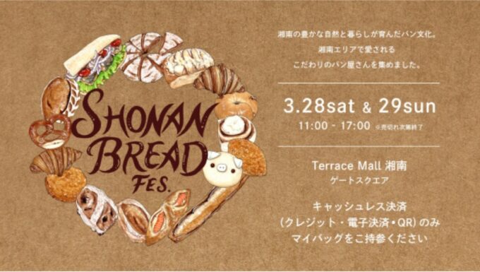 湘南エリアで愛されるこだわりのパン屋さんを集めました!!2日間延べ約20店舗予定。 ※キャッシュレス決済(クレジット・電子決済・QR)のみ ※マイバッグをご持参ください