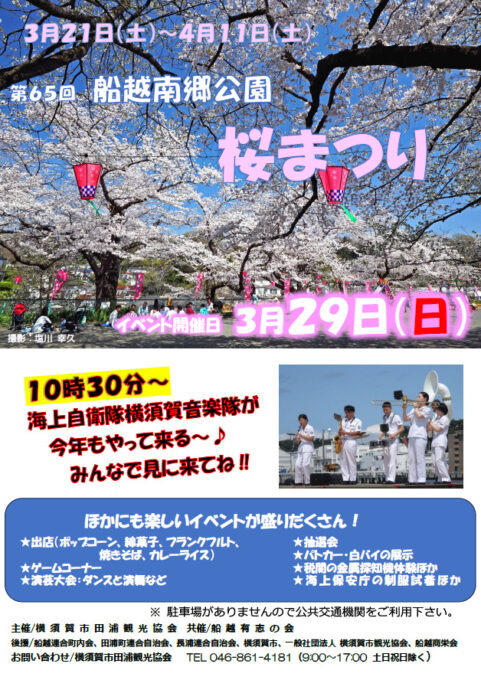 3月29日はイベントも開催!今年も海上自衛隊横須賀音楽隊がやってくるほか、飲食店の出店やゲームコーナー、パトカー・白バイの展示なども。