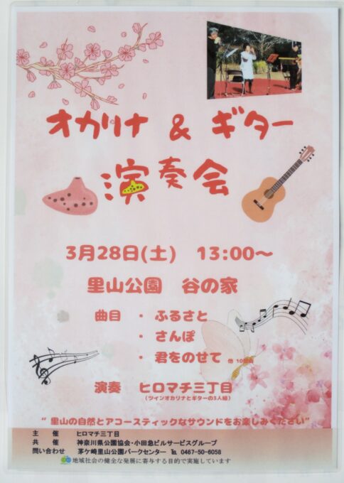 桜が見頃を迎える時期、囲炉裏がある古民家風の建物に、オカリナやギターの優しい音色が響きます。ふるさと、さんぽ、君をのせてなど。