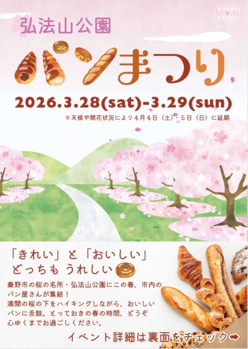 秦野市の桜の名所・弘法山公園に市内のパン屋さんが集結!満開の桜のもと、お花見ハイキングと美味しいパンをお楽しみください。 ※パンが売り切れ次第終了 ※天候や開花状況により、4月4日(土)、5日(日)へ延期する場合があります
