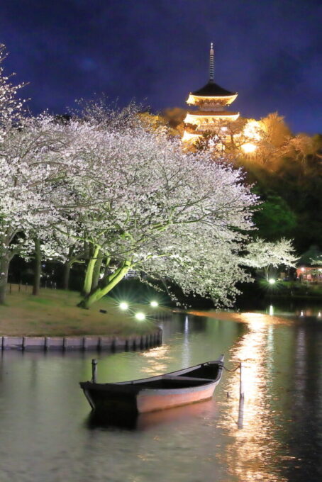 三溪園内へ一歩足を踏み入れると、そこには古建築と自然が調和した風情あふれる空間が広がります。3月中旬~4月上旬は9種類約250本の桜が咲き誇り、関東圏では珍しい岐阜県ゆかりの桜も愛でることができます。夜には、桜だけではなく、旧燈明寺三重塔をはじめとした歴史的建造物にも光を照らし、黄金色に光り輝く姿をご覧いただけます。広大な日本庭園で、昼と夜で異なる情趣を見せる桜と歴史的建造物の競演をお楽しみください。
