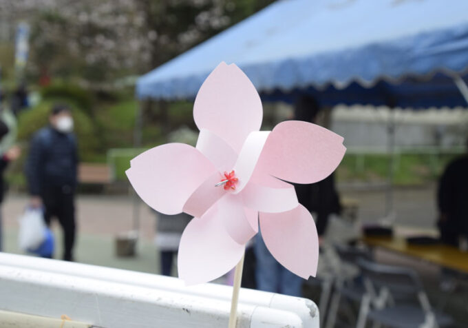 桜型のかざぐるまの無料工作です。1人1本までお作りいただけます。