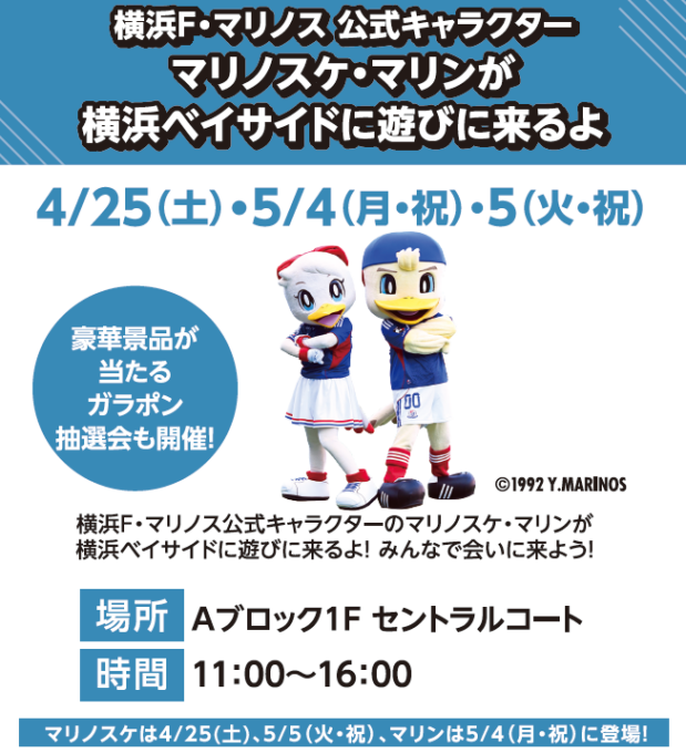 横浜F・マリノス公式キャラクターのマリノスケ・マリンが横浜ベイサイドに遊びに来るよ!