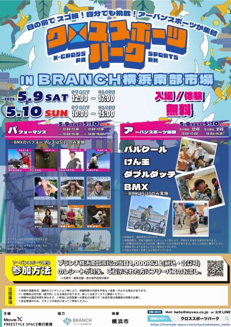 パルクール・ダブルダッチ・BMX・けん玉のパフォーマンスやアーバンスポーツ体験、体験の参加方法はHPをご確認ください。