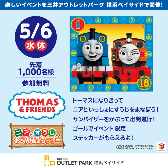 トーマスになりきってニアといっしょにすうじをまなぼう!サンバイザーをかぶって出発進行!ゴールでイベント限定ステッカーがもらえるよ!