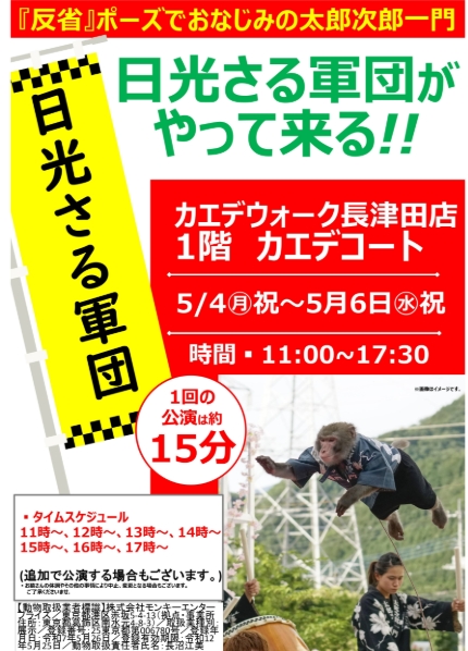 日光さる軍団がカエデウォーク長津田店にやってきます。演者とおさるさんの息のあった演技、楽しく愉快なトークをお楽しみください。ご来店をお待ちしております。1 日に数公演を行う予定です。詳しいタイムスケジュールは会場の看板をご覧くださいませ。お猿さんの体調やその他の事情により中止、変更となる場合もございます。ご了承くださいませ。