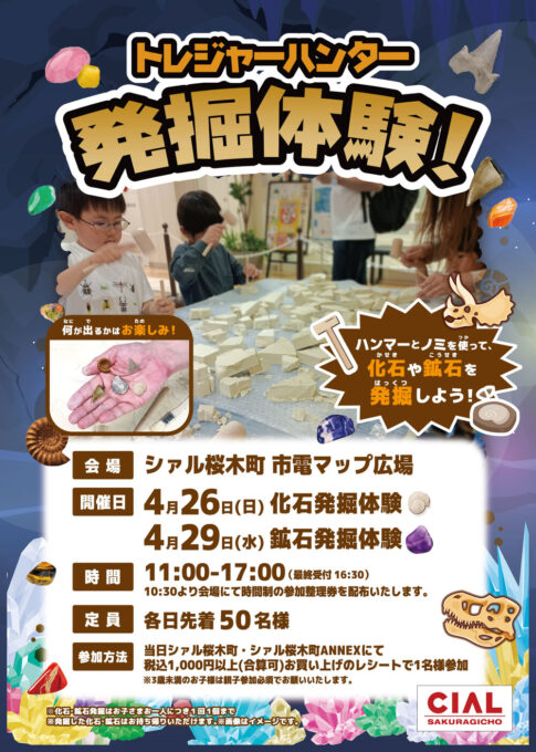 シァル桜木町 市電マップ広場にて【トレジャーハンター発掘体験!】の開催が決定!ハンマーとノミを使って、化石や鉱石を発掘しよう!日シァル桜木町・シァル桜木町ANNEXにて税込1,000円以上(合算可)お買い上げのレシートで1名様参加 ※3歳未満のお子様は親子参加必須でお願いいたします。