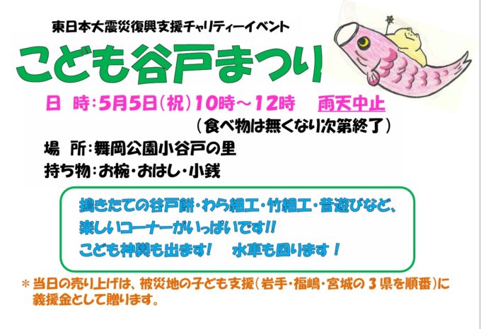 恒例の東日本大震災復興支援チャリティーイベントを行います。鯉のぼりが舞う小谷戸の里に遊びにいらしてください。