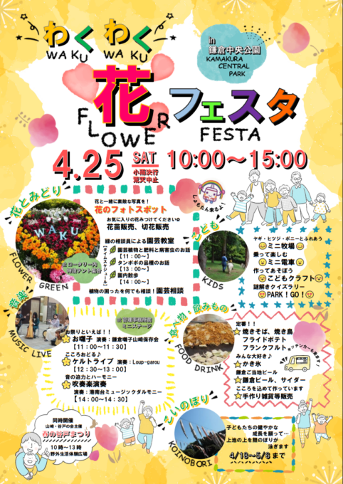 【鎌倉中央公園:わくわく花フェスタ/春の谷戸まつり】同時開催!ミニ電車、ミニ牧場、ステージ演奏、工作&体験、焼きそば、焼き鳥、フライドポテト…親子一緒に春の公園で楽しもう![2026年4月25日(土):鎌倉市]