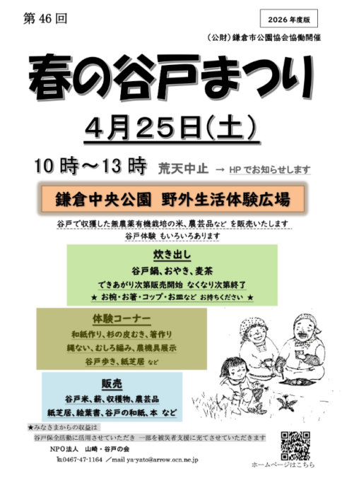 野外生活体験広場 で、 和紙作り、杉の皮むき、箸作り、谷戸歩き、紙芝居などの体験コーナーや、谷戸鍋・おやき・麦茶の炊き出しなど、さまざまな催しが用意されています。無農薬有機栽培の米や農芸品などの販売も♪盛りだくさんの内容です!