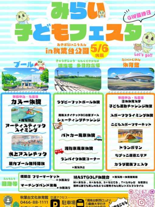 遠出もいいけど混雑するし…、近場で思いっきり楽しみたい!と思っているパパさん、ママさんには藤沢市の公園、体育館、温水プールなどの施設で行われる「みらい子どもフェスタ」がおススメ!