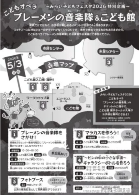 フォトブース以外は公演のチケットがなくてもOK!無料で参加できるものもありますので、こどもオペラ「ブレーメンの音楽隊」の公演前や公演後に参加してみよう!