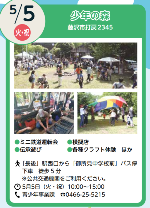 楽しいゴールデンウィーク!遠出もいいけど、藤沢市内各所で思いっきり遊んでみてはいかがですか?たくさんのイベントに参加しまくるのもOK!お気に入りを見つけて、ピンポイントの参加もOK!気分や予定に合わせて、ぜひ行ってみてくださいね!