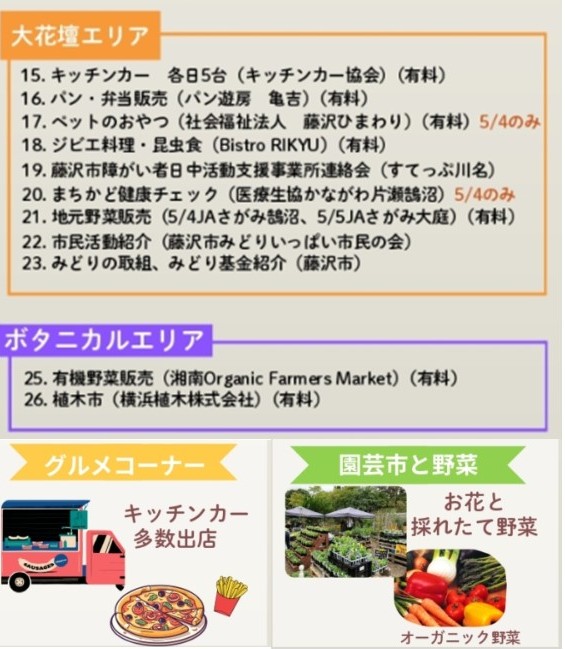 正面入口すぐの大花壇エリア、その奥にあるボダニカルエリアでは、キッチンカーや地元の野菜販売などのブースが並びます。親子でお腹も満たせそうですね♪新鮮野菜やお花をお買い物するのもおススメです。