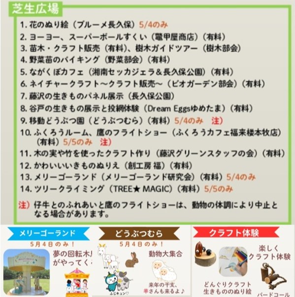 【長久保公園:春のみどりと花のまつり】大人気のメリーゴーランドが今年も登場♪移動どうぶつ園、ふくろうさんもやってきます!キッチンカー、クラフト体験、ツリークライミングなど盛りだくさん! [2026年5月4日(月)・5日(火):藤沢市]